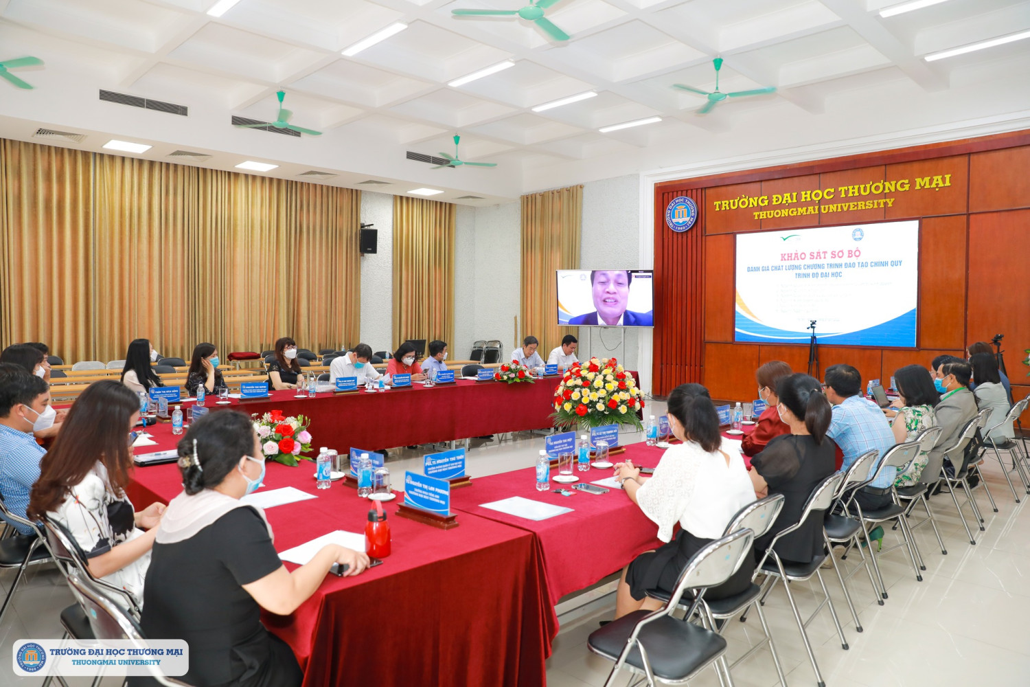 Tham dự theo hình thức trực tuyến về phía Đoàn đánh giá ngoài của Trung tâm Kiểm định chất lượng giáo dục – Đại học Quốc gia Hà Nội có TS, Tạ Thị Thu Hiền - Giám đốc trung tâm Kiểm định chất lượng giáo dục – Đại học Quốc gia Hà Nội; GS, TS Nguyễn Hữu Đức – Trưởng đoàn đánh giá ngoài. Về phía Trường Đại học Thương mại có PGS, TS Bùi Hữu Đức – Bí thư Đảng ủy, Chủ tịch HĐT; các thành viên Hội đồng TĐG, nhóm chuyên trách và ban thư ký TĐG các CTĐT, Trưởng một số phòng ban và cơ sở Hà Nam.