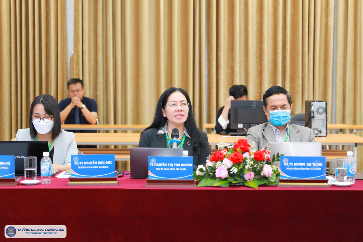 Có mặt trực tiếp tại Trường Đại học Thương mại để tiến hành khảo sát có TS. Nguyễn Thị Thu Hương – Thư ký đoàn đánh giá ngoài; GS, TS Hoàng Bá Thịnh – thành viên đoàn đánh giá ngoài; ThS. Trịnh Thị Nhung – thành viên Trung tâm Kiểm định chất lượng giáo dục – Đại học Quốc gia Hà Nội; ThS Bùi Thị Thu Thủy, ThS. Nguyễn Thị Kim Ánh – Giám sát đoàn đánh giá ngoài.