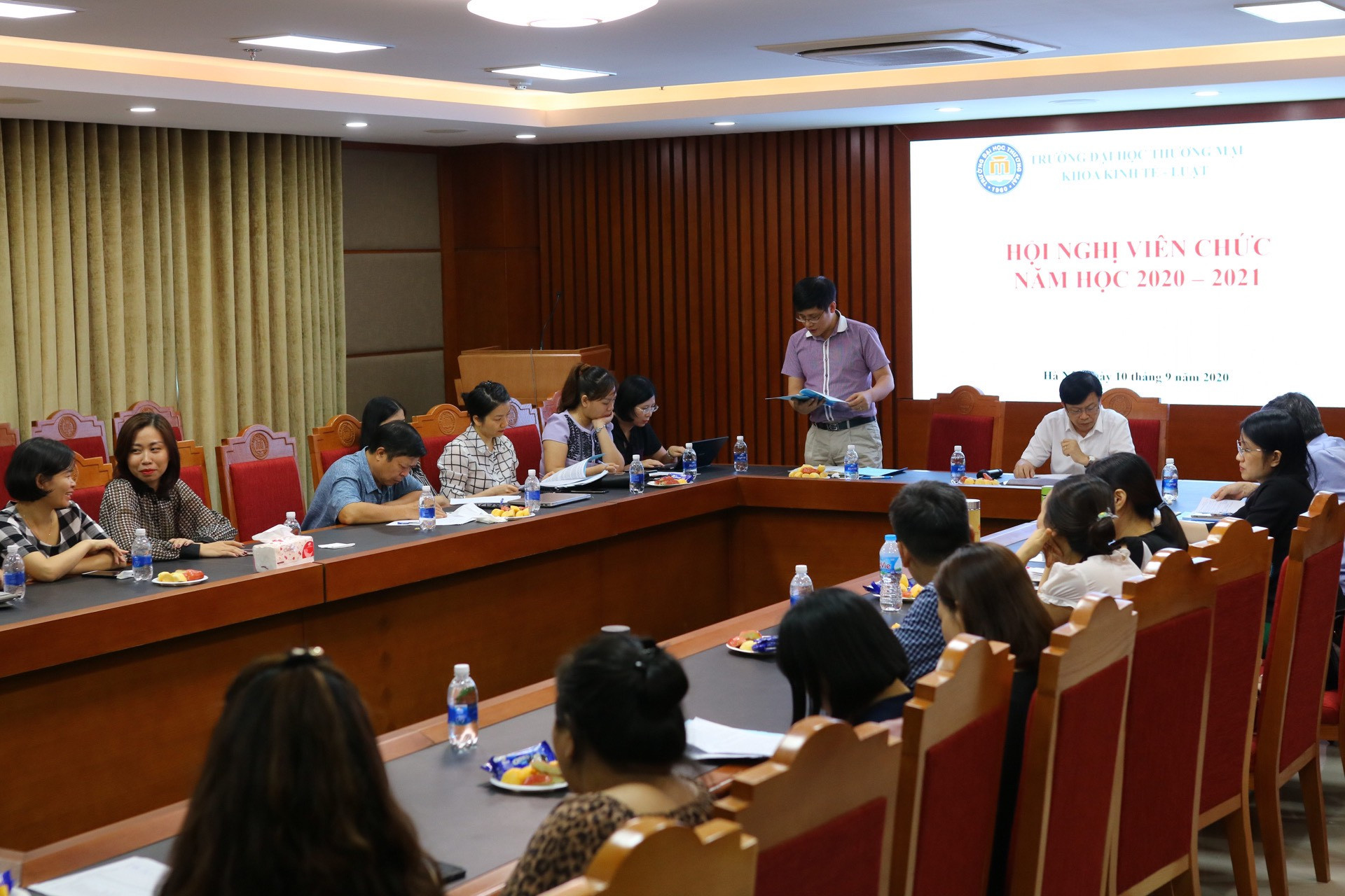 Thực hiện kế hoạch tổ chức hội nghị công chức, viên chức trường Đại học Thương mại năm học 2020-2021, theo kế hoạch số 621/KH-ĐHTM ngày 21/072020; được sự chỉ đạo của Đảng ủy, BGH nhà trường, vào hồi 14h00 ngày 10/09/2020 tại phòng họp số 2 nhà F, Khoa Kinh tế - Luật đã tổ chức Hội nghị cán bộ viên chức năm học 2020-2021.