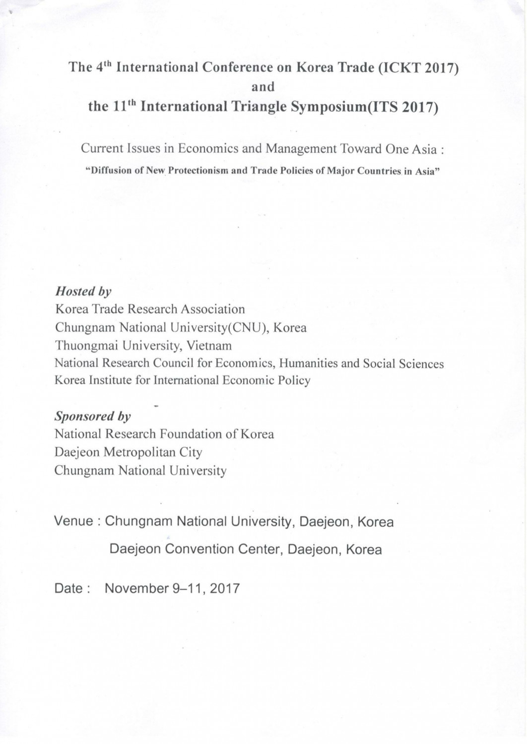 Từ ngày 17 đến 22 tháng 8 năm 2017, đoàn công tác trường Đại học Thương mại bao gồm: Hiệu trưởng GS,TS. Đinh Văn Sơn làm trưởng đoàn, Chủ tịch HĐ Trường, Trưởng phòng Quản lý Khoa học, Trưởng phòng Đối ngoại & Truyền thông đã có chuyến công tác tại Trường Đại học quốc gia Chungnam, Hàn Quốc để trao đổi kế hoạch tổ chức Hội thảo Quốc tế với chủ đề: “Chủ nghĩa bảo hộ và chính sách thương mại của các cường quốc trong khu vực Châu Á” dự kiến diễn ra vào ngày 9-11 tháng 11 năm 2017 Tại thành phố Deajon, Hàn Quốc.