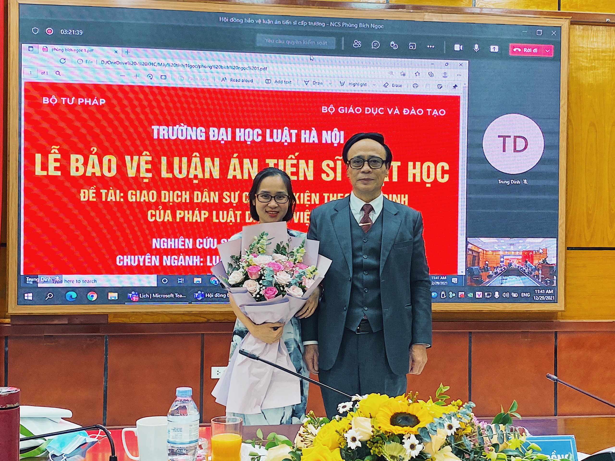 Ngày 29/12/2021, tại Trường Đại học Luật Hà Nội đã tổ chức Lễ bảo vệ Luận án tiến sĩ khoa học cấp trường cho nghiên cứu sinh (NCS) Phùng Bích Ngọc, Chuyên ngành: Luật Dân sự và Tố tụng dân sự. Mã số: 9 38 01 03 với Đề tài luận án: “Giao dịch dân sự có điều kiện theo quy định của pháp luật dân sự Việt Nam”.