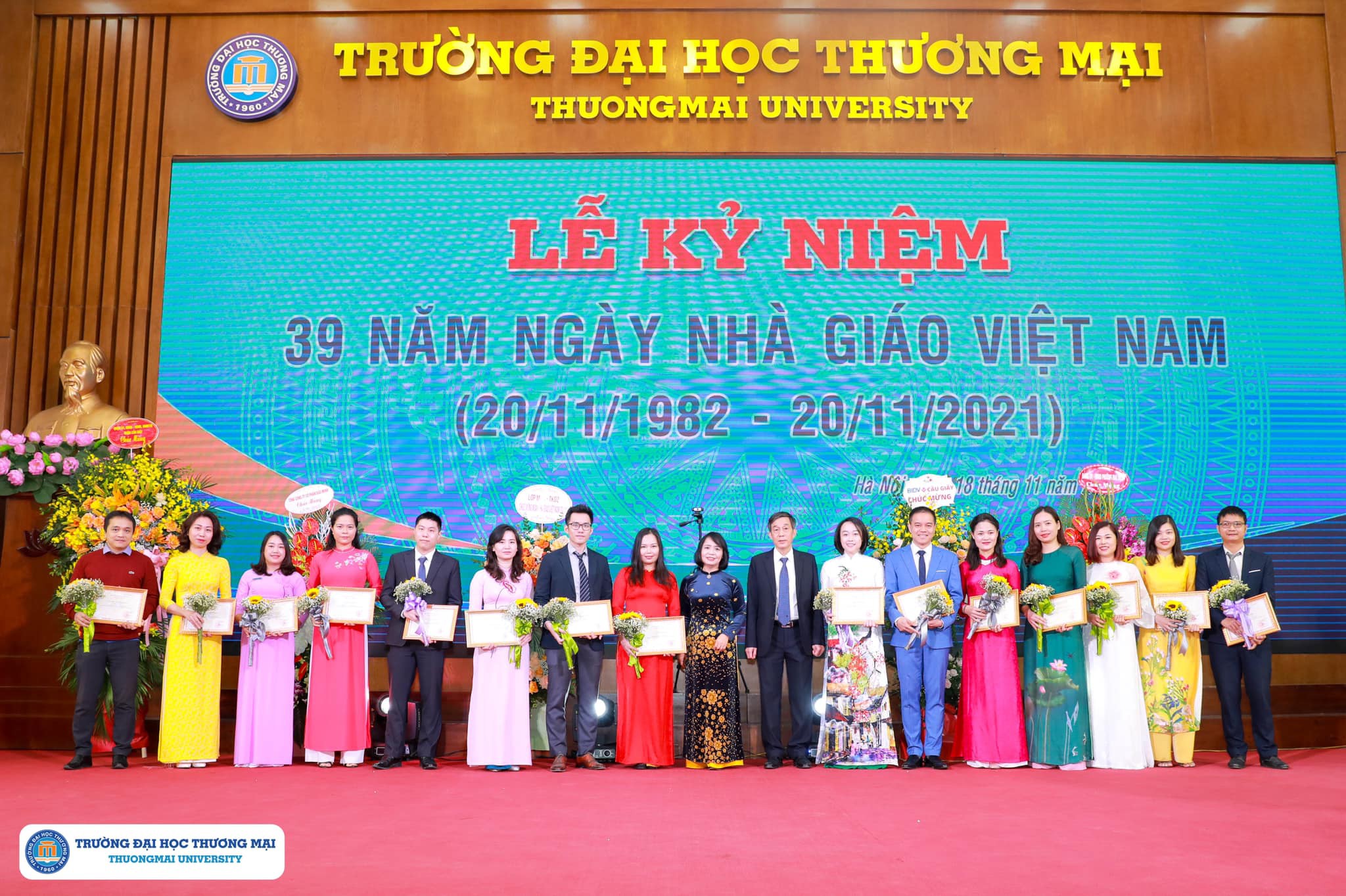 Tại buổi lễ này Trường Đại học Thương mại đã vinh danh 01 nhà giáo được phong tặng danh hiệu Nhà giáo nhân dân: GS.TS Đinh Văn Sơn cùng 8 Nhà giáo được phong tặng danh hiệu Nhà giáo ưu tú lần thứ 15 và tuyên dương các nhà giáo, cán bộ quản lý tiêu biểu năm 2021 được tổ chức tại Trung tâm Hội nghị 37 Hùng Vương ngày 14/11/2021 vừa qua.