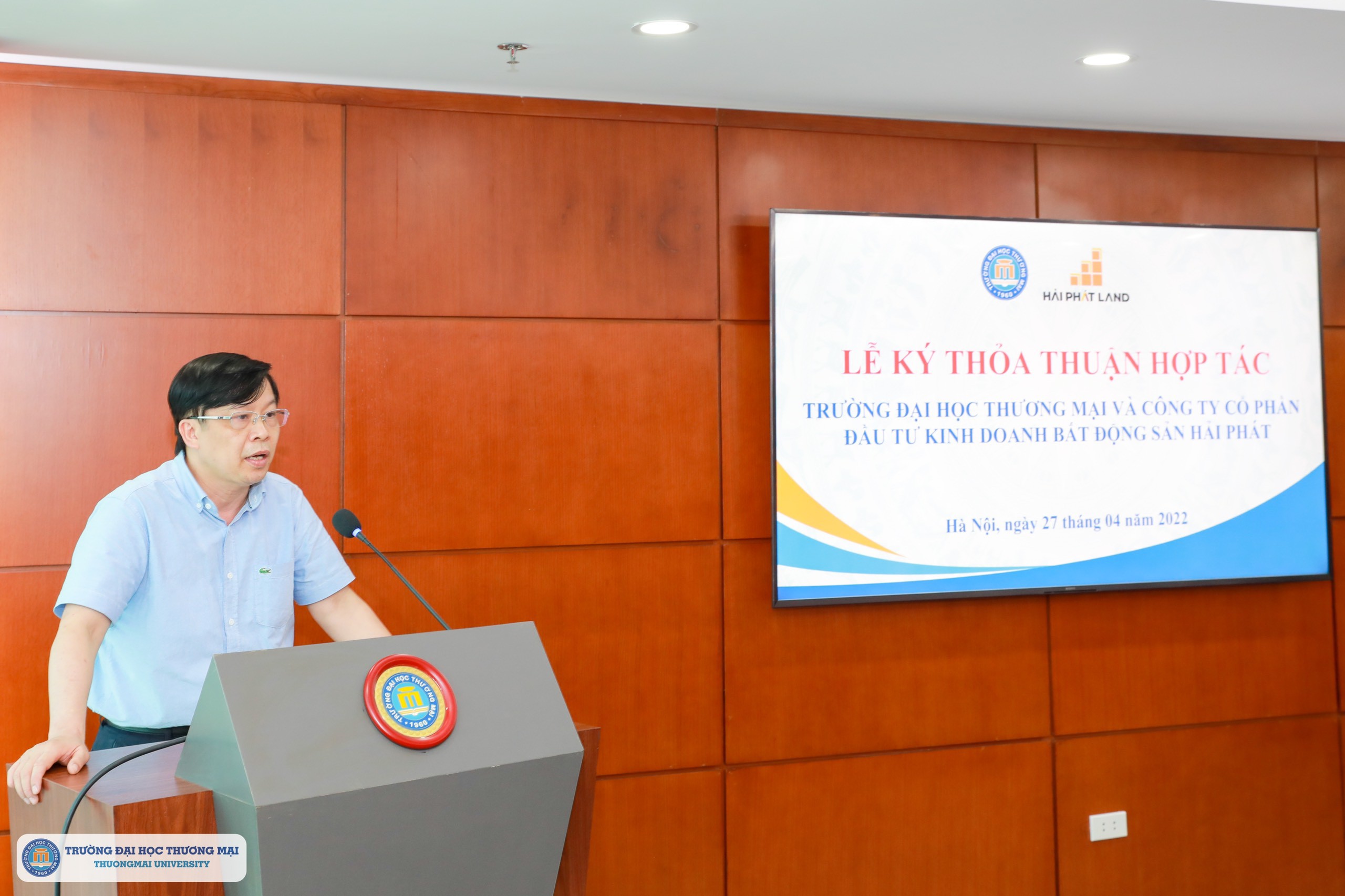 Sáng ngày 27/4/2022, tại Phòng khánh tiết, Trường Đại học Thương mại đã diễn ra Lễ ký thỏa thuận hợp tác giữa Trường Đại học Thương mại và Công ty Cổ phần Đầu tư Kinh doanh Bất động sản Hải Phát