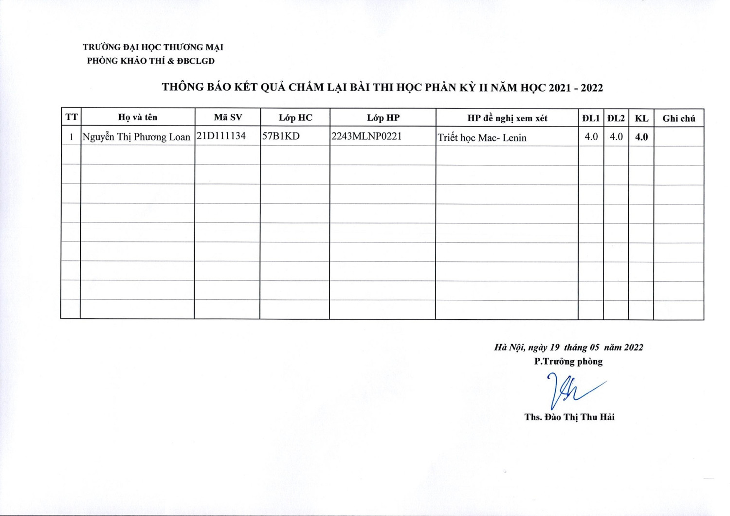 Thông báo kết quả chấm lại bài thi học phần kỳ 2 ( 2021-2022) Lần 3
