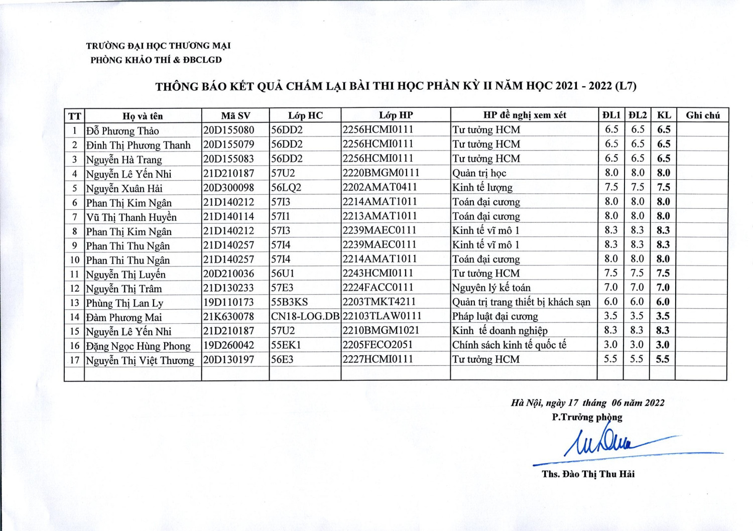 Thông báo kết quả chấm lại bài thi học phần kỳ 2 năm học 2021-2022 (L7)