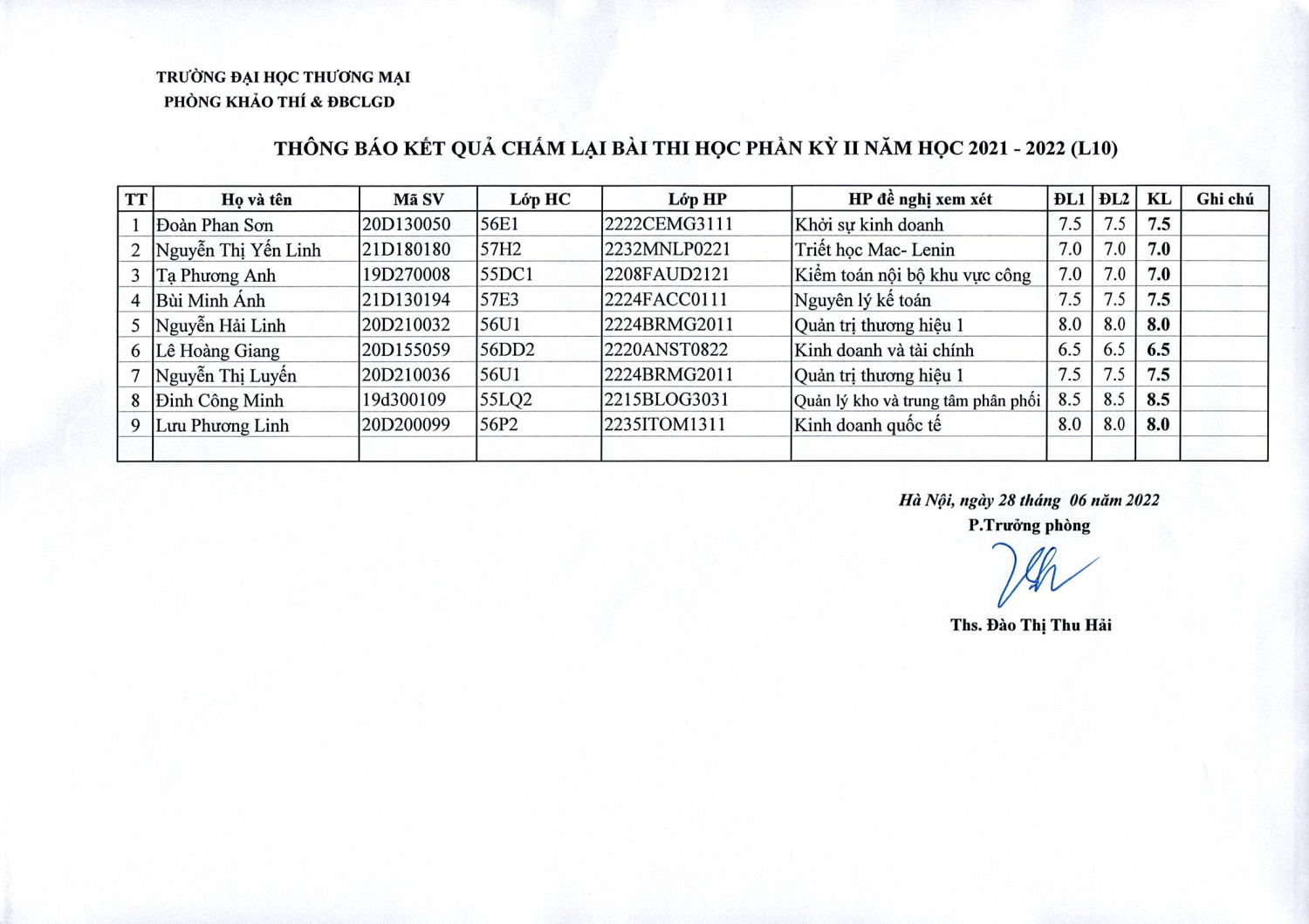 Thông báo kết quả chấm lại bài thi học phần kỳ II năm học 2021-2022 (L10 )